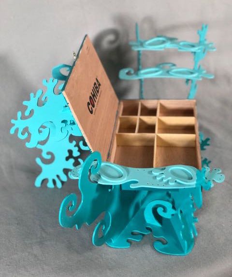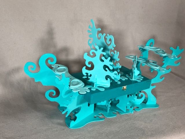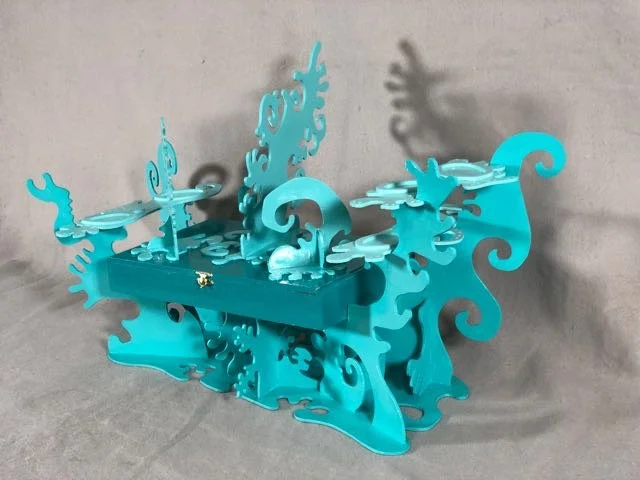 Jewelry Box; 2022. I was given a cigar box. Using 1/8” plywood, I created the interior divisions in the box.. I used the 1/8” plywood for the scrolled exterior elements, creating places to hook, hang and set jewelry. I drilled holes in many of the curlicues to hang earrings. Painted in enamel paint.