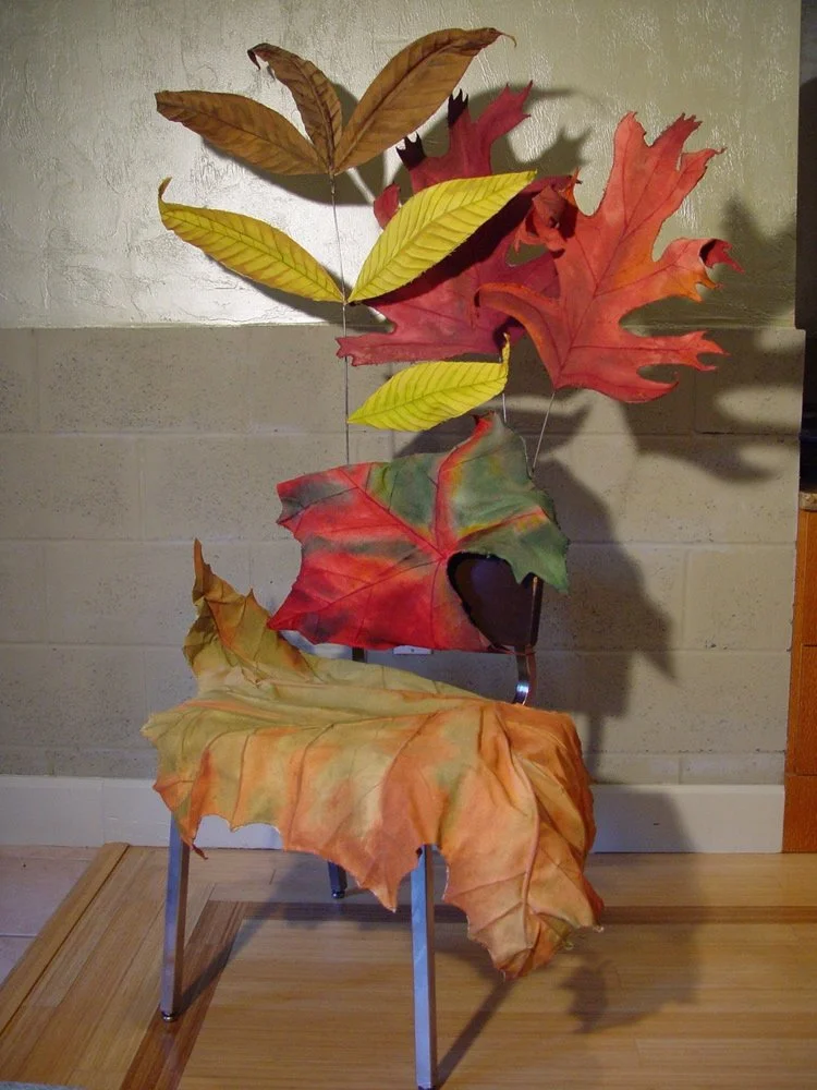 Autumn Chair 2010. Perhaps my first donation to the Friends of Elementary Arts fundraiser was this chair. Artists were given chairs or small tables to create on. With this one I soldered together a metal framework for each leaf. I cut the leaf shapes out of canvas and glued the canvas to the front and back of the metal frame. I Painted the leaves with acrylic paint and then bent them to drape over the frame of the chair. It is meant to be sat in!